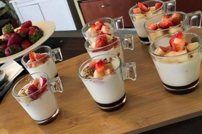 יוצקים לתוכם בתחתית מעט סילאן, מוזגים מעליו יוגורט ומעל מפזרים גרנולה ופירות קצוצים, תותים, תפוחים. דובדבנים… מה שבא לכם, טעים ובריא.