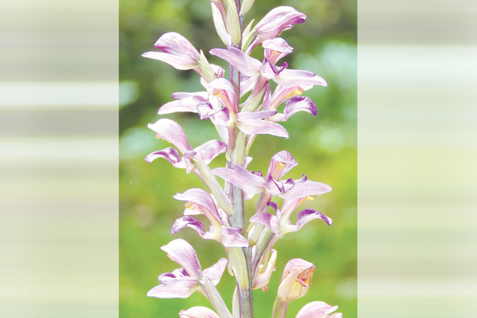 שנק החורש פורח בעמודי פריחה גבוהים בעלי פרחים גדולים וסגולים, אי שם במעבה החורש של יער אודם, בצל האלונים העבותים והמוזר מכול: לצמח זה פשוט