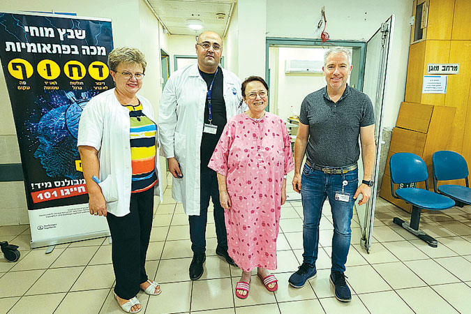 בשבת אחת, הצילו ביחידה לשבץ מוחי, במרכז הרפואי "צפון", שלושה מטופלים באמצעות צנתור מוח חירום בתמונה: מימין לשמאל – ד"ר ערן מאירוביץ', אינה גוסליצר, ד"ר